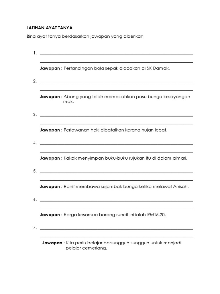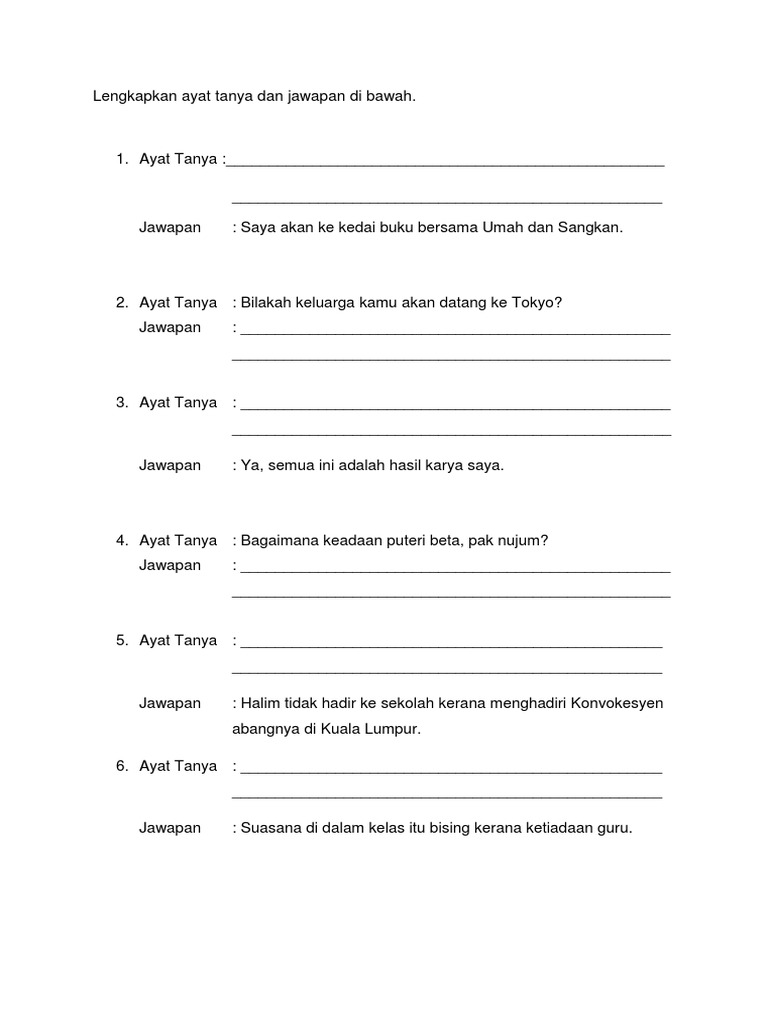 Contoh Ayat menggunakan Perkataan soalan dalam bahasa Melayu. Tulis ayat tanya yang paling sesuai bagi jawapan yang diberi. Tulis ayat tanya yang paling sesuai bagi jawapan yang diberikan.